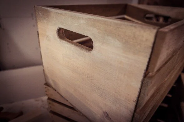 After I wiped the crates down with a tack cloth to remove the dust, I took another Minwax stain, this time in Special Walnut (which we already had around as a test stain for the slat wall), and applied it around the edges of each side with a brush. I let the stain soak in for a few minutes before wiping it with a cloth and buffing/blending the edges of the stain into the white washed areas. I wanted the crates to look worn in the middle but still maintain the colour around the sides. Again, I played with a few random techniques until I got the look I wanted using my inspiration pics as reference.