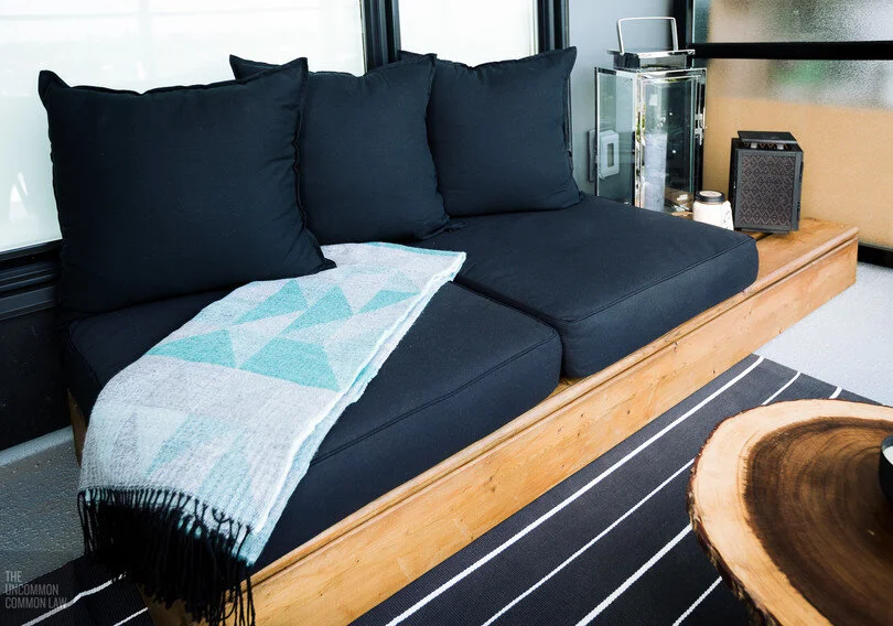 I let the stain dry for 12 hours before putting the cushions back on. I got the base cushions from Ikea but the back cushions I wanted were sold out. Since the deck is covered I wasn't too bothered by getting non weather proof fabric, so I picked up some plain black covers (which look like the same fabric as the seat covers anyway) and three 20x20 pillow forms. The pillow forms were a little too small for the covers and looked cheap and sloppy so I ended up putting two forms in each cover to bulk them up. The pillows were only $5 each so it wasn't too outrageous to buy enough for just three cushions.