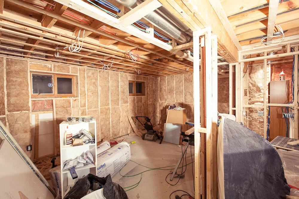 Last winter, our home was freezing! The basement had next to no insulation and it didn't seem to make sense to heat the unfinished space that we barely used. We demolished everything, framed up new 2x4 walls and installed R-20 insulation. We sealed up the laundry room properly, foamed up all the little holes, and picked up some heaters with a smaller footprint to replace the old larger ones.